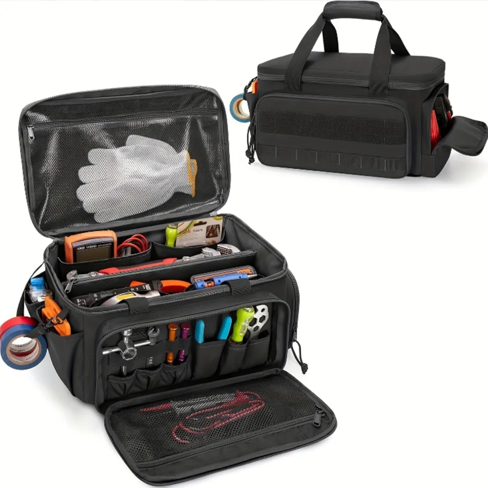 With a boxy structure, wide-opening compartments, and multiple internal and external storage sections, it is suitable for buyers looking for custom tool bags, heavy duty tool bags, and wholesale work gear projects.